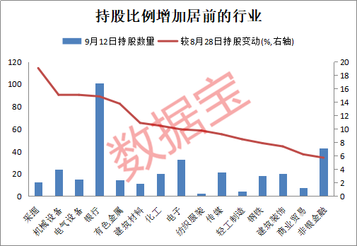 具体来看,采掘行业最新持股数量合计12.69亿元,增幅居首,超过19%;其次是机械设备、电气设备行业,加仓幅度均超过15%;另外,银行、有色金属及建筑材料等4行业持股数量均增加10%以上。