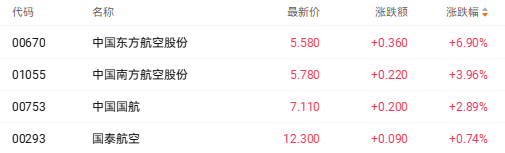 今日港股航空板块表现亮眼。截至发稿,中国东方航空股份(00670.HK)涨6.90%、中国南方航空股份(01055.HK)涨3.96%、中国国航(00753.HK)涨2.89%。