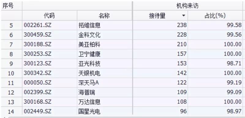 金科文化被调研频次也达228次,百亿级私募高毅资产、源乐晟资产、和聚投资等均对其进行了调研。万达信息也吸引了百余家机构前来调研。