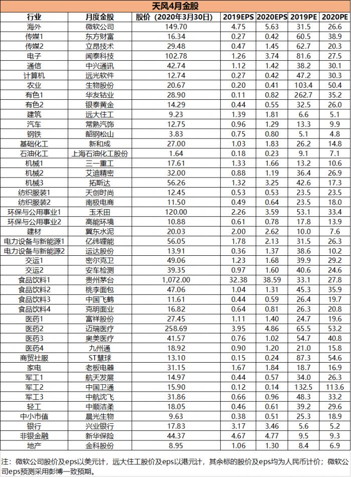 仍强调三条基本主线:一是在美元流动性紧张情况下被动抛售的优质资产,重点看好医疗保健、日常消费、金融领域陆股通相关标的,二是风险偏好提升条件下,更加具有弹性的新基建领域,以及稳增长相关的建筑建材、家电、汽车领域投资机会,三是存在阶段性供需错配或市场均值回归形成涨价品。基于以上逻辑,优选以下行业个股构成4月金股组合,供投资者参考:1)本期组合配置商贸零售(10%)、农林牧渔(10%)、医药生物(10%)、建筑装饰(10%)、建筑建材(10%)、家用电器(10%)、电新(10%)、通信(10%)、汽车(10%)、食品饮料(10%).