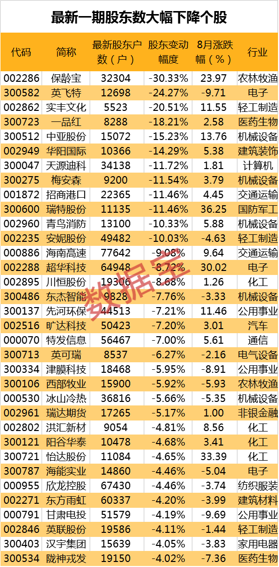 34家公司最新一期股东户数下降幅度超4%。