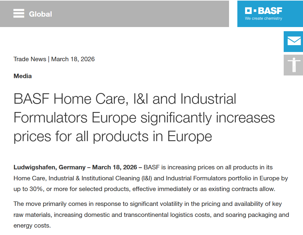 全球化工巨头巴斯夫(BASF)周三发表声明称,将对其在欧洲地区的家用护理、工业与机构清洁(I&I)以及工业配方业务组合中的全部产品提价,涨幅幅度可达30%,甚至还有“个别产品涨幅更高”。