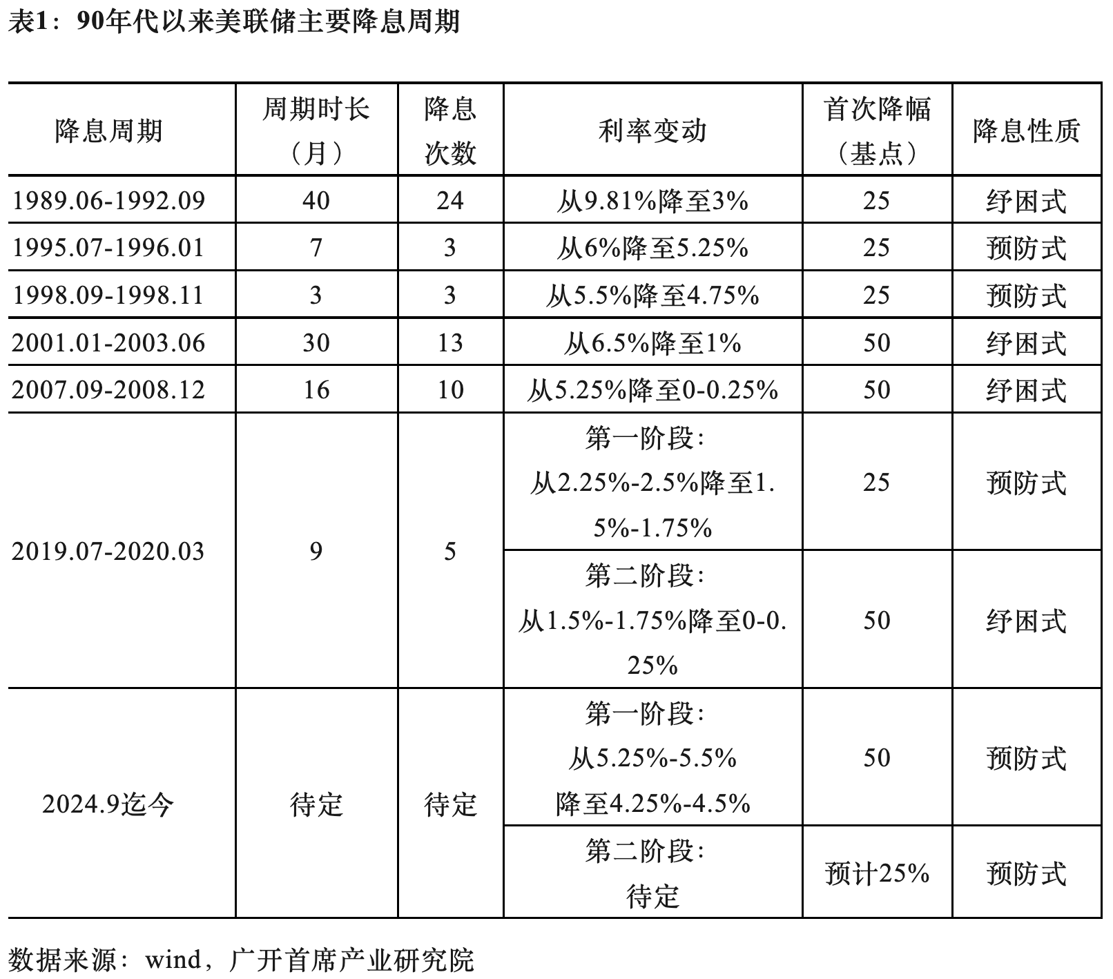 纾困式降息是指在经济已处于严重的衰退状态,或遭遇到突如其来的重大冲击时,央行采取连续、大幅的降息动作,以缓解经济困境。如2020年为应对疫情采取的大幅降息的“量化宽松”政策。上世纪90年代以来,美联储经历了6轮比较明显的降息周期,包括两轮预防式降息和三轮纾困式降息,以及一轮由预防式降息和纾困式降息叠加的混合式降息。