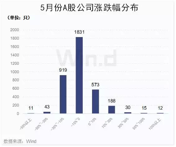 5月以来,个股也普跌,仅818只个股逆势上涨,占比22.58%,而剩余超7成个股出现下跌。