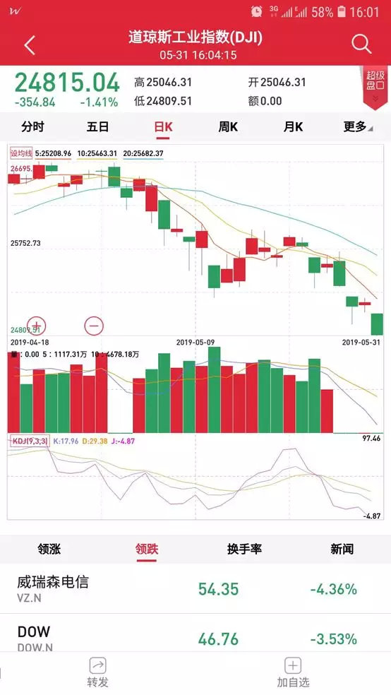 5月31日,美股市集体下跌,道指跌超350点,失守25000点,美三大股指均创2019年以来最大单月跌幅。截至收盘,道指跌1.41%报24815.04点,连跌六周,创2011年以来最长连跌周数,5月份累计跌6.69%;标普500跌1.32%报2752.06点,连跌四周,月跌6.58%;纳指跌1.51%报7453.15点,连跌四周,5月份共下跌7.93%。