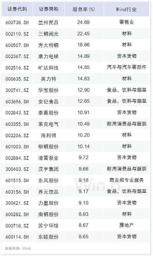 Wind数据统计显示,截止5月31日,去年两市共计1110家公司实施了现金分红,若以最新收盘价计算,其中434家公司股息率超过了1年期定存收益(1.5%)。值得一提的是有62家股息率超过5%,完爆当前市场上的各类理财产品。其中,兰州民百、三钢闽光、方大特钢、康力电梯、旷达科技等12家公司最新股息率更是超过10%。