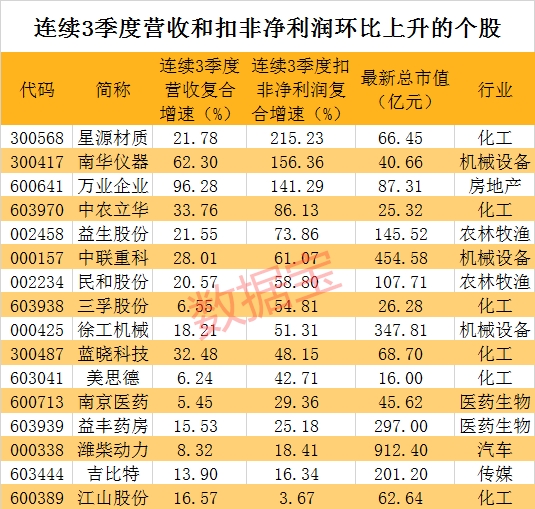 营收和净利润环比连增的个股中,9股连续3季度扣非净利润复合增速超过50%,星源材质、南华仪器和万业企业扣非净利润复合增速超过100%。