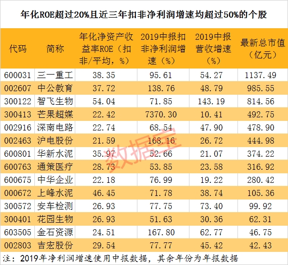 在近三年扣非净利润增速均超过50%的短期爆发式高增长非次新股中,14股展现出了优异的盈利能力,最新中报年化净资产收益率(ROE)超过20%,而在全部A股上市公司中,年化ROE超过20%的个股尚不足200家。