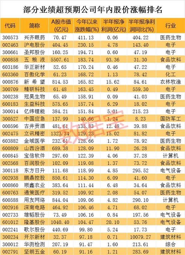 除电子公司外,医药公司如兴齐眼药、冠昊生物、金域医学、通策医疗,食品饮料行业公司如五粮液、古井贡酒、山西汾酒、百润股份、顺鑫农业等年内股价均已翻倍。