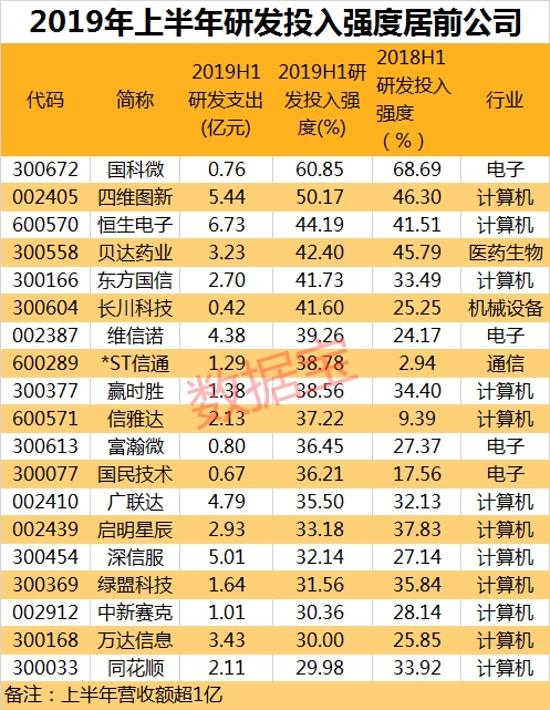 具体到个股来看,16股今年中期研发投入强度超10%,虹软科技、航天宏图、微芯生物等5股更是高达20%以上,这一占比远超过作为超级科技公司的华为,在沪深两市中也处于极为领先位置。
