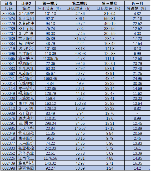 值得关注的是,一些公司不仅近三个季度业绩连续环比稳定增长,三季度净利润同比也实现增长,这类公司共有22家。其中业绩同比增长超过100%的公司有光正集团、大庆华科、星期六等9家,这些公司若近期的涨幅不大,是真正的盈利增长潜力股。