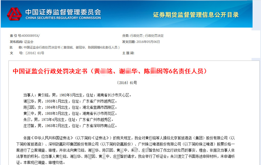 而在2016年5月,历经长期调查,关于黄某铭团队操纵市场的罚单终于落地,证监会最终认定,黄某铭等人操纵首旅酒店、劲嘉股份、珠江啤酒3只个股,合计违法所得达到3.25亿元。其中,黄某铭被责令依法处理非法持有的证券,并罚没6.49亿元;对团队成员谢某华、陈某囡、黄某中、朱某给予警告并分别处以90万元罚款。