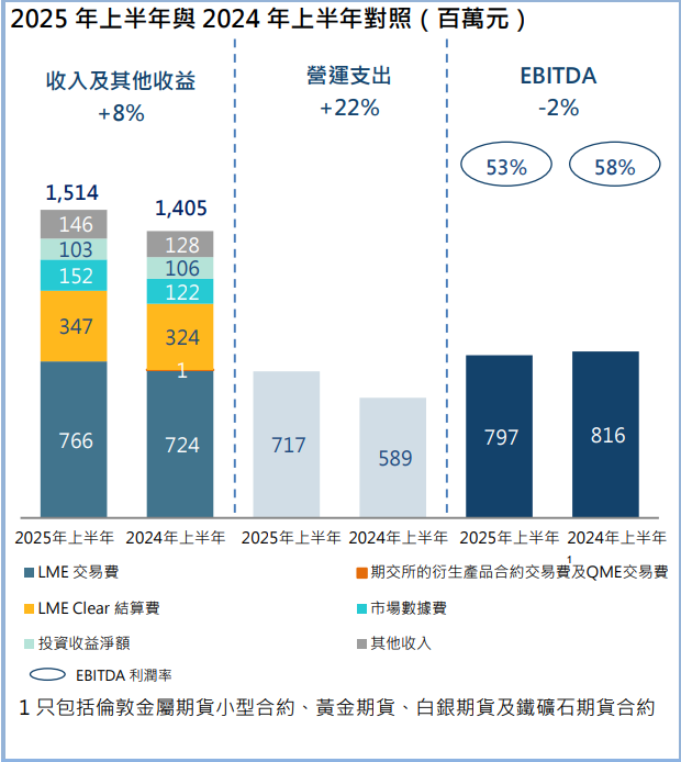受制裁及关税影响,金属市场波动加剧,但2025年上半年LME金属交投量仍维持稳健。LME收费交易金属合约的平均每日成交量同比上升3%。