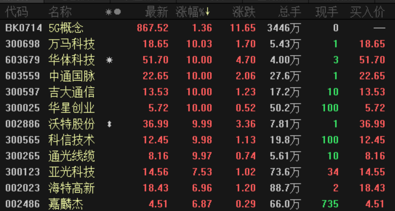 今日早盘,5G板块再度活跃,德威新材、万马科技、依米康、中通国脉等11股涨停,海特高新、亚光科技、通鼎互联等涨幅居前。