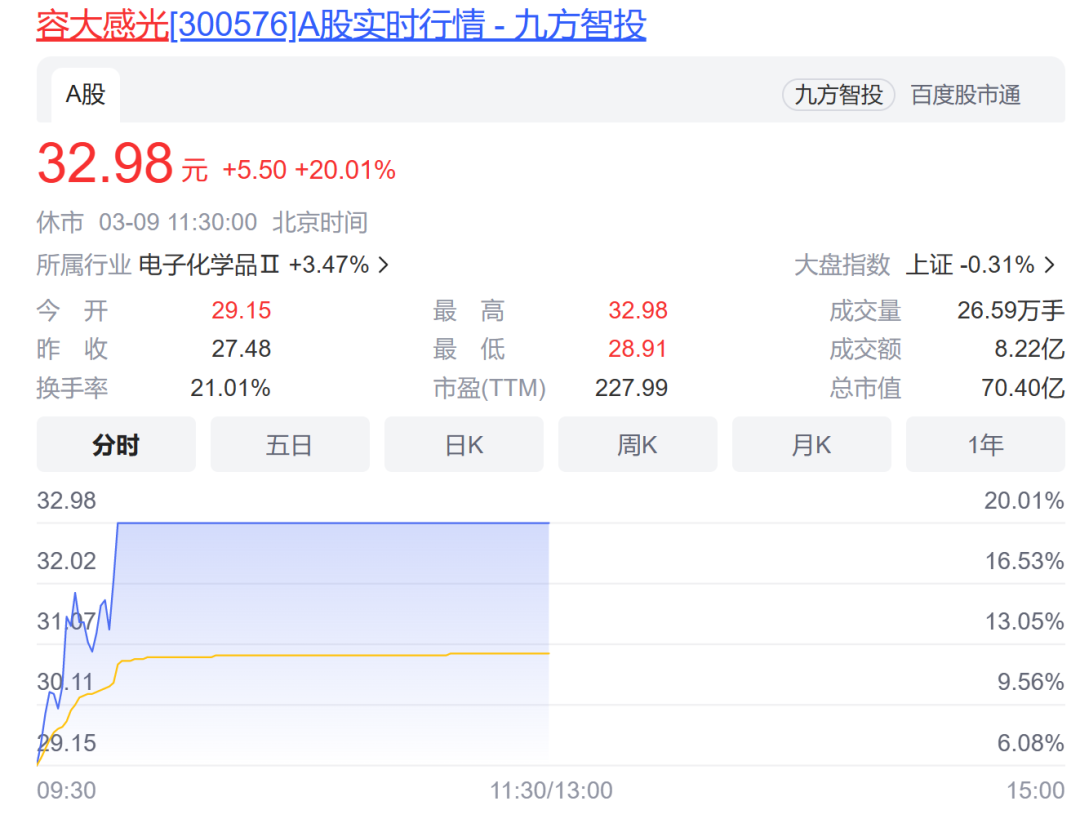 容大感光昨日午后开盘直线拉20%涨停,今日继续大幅高开后涨停,股价创1年来新高。