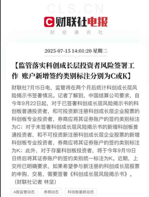 记者了解到,中国结算公司要求,自今年9月22日起,对于已签署科创成长层风险揭示书的科创板普通投资者,和可投资新注册科创成长层企业股票的科创板专业投资者,券商应将其证券账户的签约类别标注为C;对于未签署科创成长层风险揭示书的新增科创板普通投资者,和不可投资新注册科创成长层企业股票的新增科创板专业投资者,券商应将其证券账户的签约类别标注为K;此外,对于存量科创板投资者,将于今年9月19日日终后将其证券账户的签约类别统一标注为K。