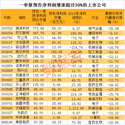 几家欢喜几家愁。142家已披露了一季报的上市公司中,21家公司一季度净利润预计逆势增长30%以上,13家公司净利润预计翻番。开尔新材、沃华医药、姚记科技、赞宇科技和阳普医疗2019年年报和2020年一季报净利润均预计翻番。