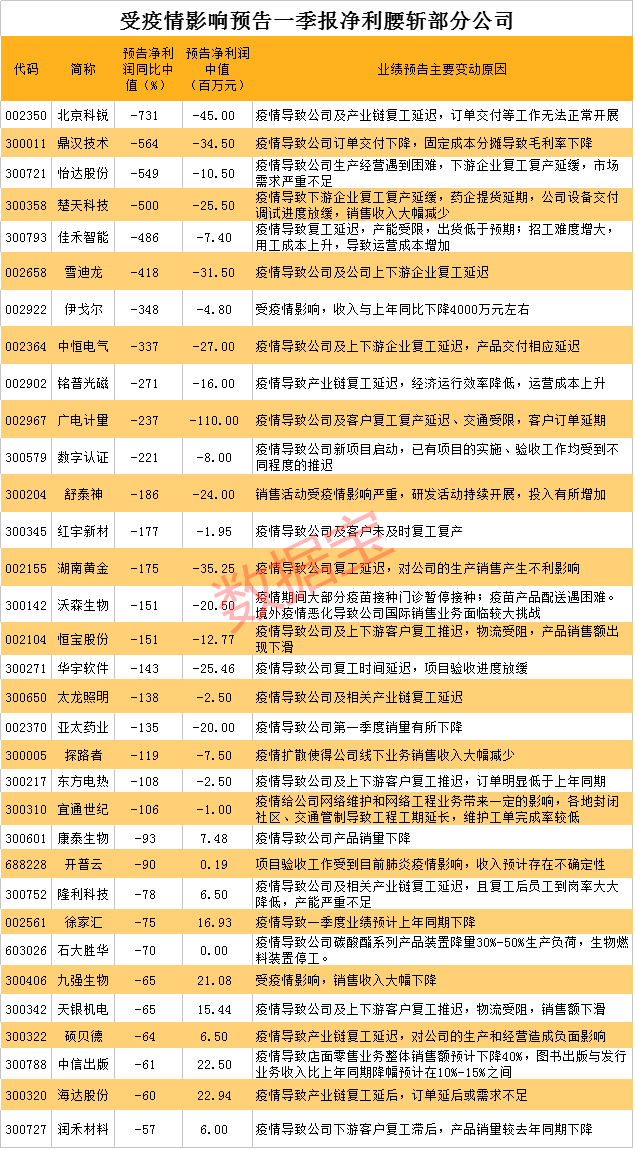主要由疫情导致净利润下滑的上市公司中,33家公司预告一季度归属于母公司净利润同比腰斩,22家公司预告净利润亏损。