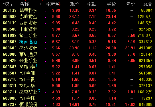 黄金概念今日盘中再度拉升走高,截至收盘,赤峰黄金、西部资源、中润资源等涨停,紫金矿业涨近9%,济南高新涨逾6%。