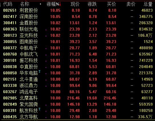 近日表现活跃的军工板块今日盘中再度爆发,截至收盘,利君股份、深南股份、金盾股份、联创光电、亚光科技、中航电子、中航沈飞、北斗星通、航发科技、博云新材、精准信息等逾20只个股涨停。