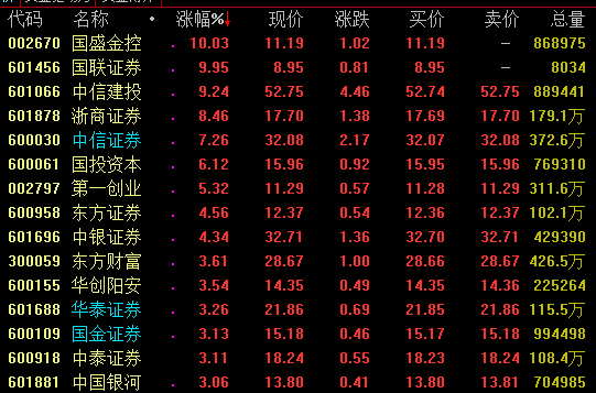 券商板块今日午后快速拉升,截至收盘,国盛金控、国联证券涨停,中信建投涨逾9%,中信证券涨逾7%,国投资本、第一创业涨幅超5%。