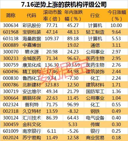 数据宝统计显示,在整体亏钱效应比较显著的环境下,18家获机构买入型评级公司今日逆势上涨。彩讯股份和中嘉博创为RCS概念股,今日收盘分别涨停和上涨3.11%。