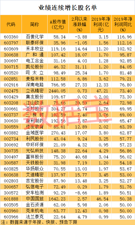 当前正值年报披露期,股价和业绩同步创下历史高点的公司会有多少呢?证券时报·数据宝统计发现,按照年报、快报、预告净利润下限计算,去年净利润增幅超过50%且为上市以来最高水平,同时上市日期在2018年以前(不含2018年)的公司共计31家。具体名单见下表: