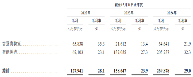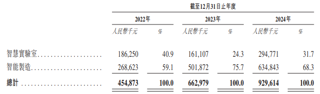 过去几年间,智能制造业务始终是镁伽科技的第一大收入来源,且该业务的收入占比整体还呈现出进一步走高的趋势。数据显示,22-24年,智能制造业务贡献的收入分别为2.69亿元、5.02亿元、6.35亿元,占比分别为59.1%、75.7%、68.3%。同期,智慧实验室业务贡献收入分别为1.86亿元、1.61亿元、2.95亿元,占比分别为40.9%、24.3%、31.7%。