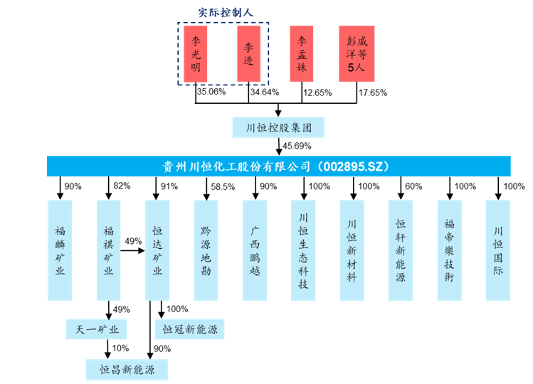川恒股份是国内精细磷化工龙头企业,实控人为李氏家族。川恒股份是精细磷化工一体化生产企业,成立于2002年,并于2017年在深交所上市。公司控股股东为川恒控股集团,持股比例46%,实控人为李光明、李进兄弟。主要子公司和孙公司中,福麟矿业、天一矿业、黔源地勘等负责磷矿开采,广西鹏越经营磷酸二氢钙、磷酸等产品的生产销售业务,恒轩新能源拥有10万吨/年磷酸铁产能。