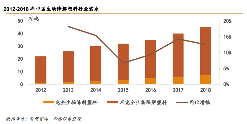鉴于成本较高的原因,生物降解塑料在国内推广难度较大,我国生物降解塑料市场一直处于供过于求的状态,大部分生产企业依托出口维持运营。尽管如此,2012-2018 年我国生物降解塑料的需求量从22万吨增长至 45 万吨,年均复合增长12.7%,依旧处于快速增长。未来随着国内对于环保重视程度提高、相关法律法规出台颁布,生物降解塑料的发展前景值得期待。