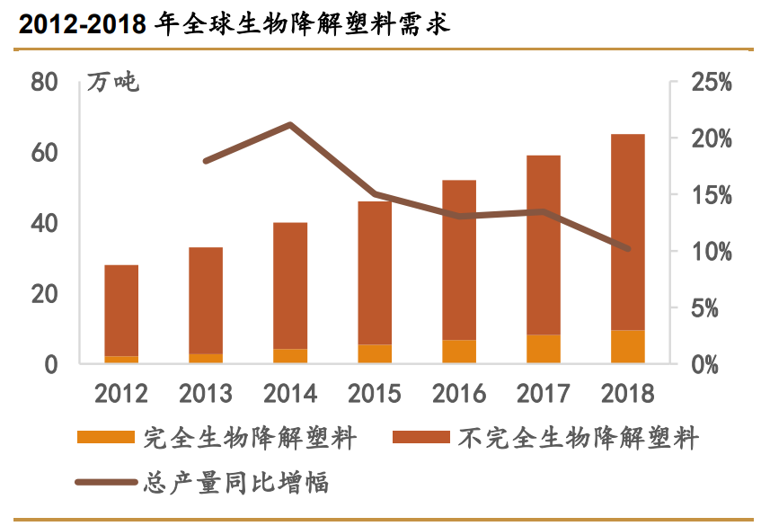 西南证券报告显示,全球生物降解塑料需求量呈较快增长趋势。2014年生物降解塑料需求130万吨,预计到2020年将达到322万吨,年均增长率达到16.7%。
