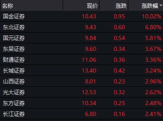 具体来看,截至上午收盘,36家上市券商全线飘红,其中国金证券率先涨停,现三天两板走势,上午主力净流入超10亿元,其中超大单净流入近7亿元,资金抢筹明显。此外,国元证券、东北证券涨幅超过5%,多只个股振幅超过8%。