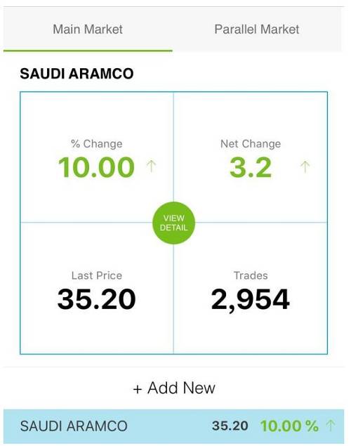 在当地时间10:30正式开盘后,阿美股价几秒钟内上涨了10%,达到了该交易所允许的每日最大涨幅。交易价为35.20里亚尔,约合每股9.50美元。