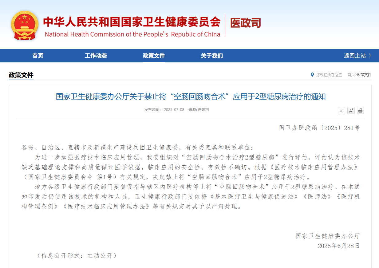 国家卫健委:禁止将“空肠回肠吻合术”应用于2型糖尿病治疗