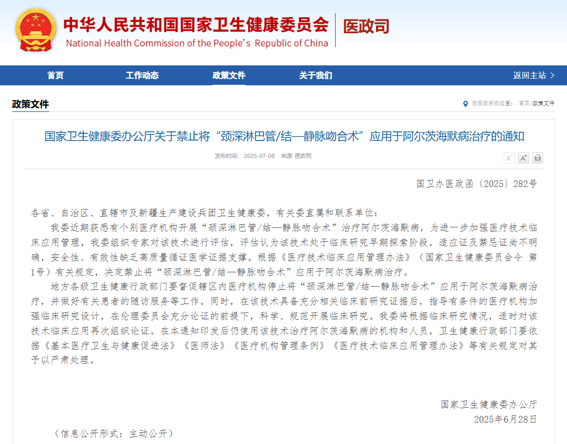 国家卫健委:禁止将“颈深淋巴管/结—静脉吻合术”应用于阿尔茨海默病治疗