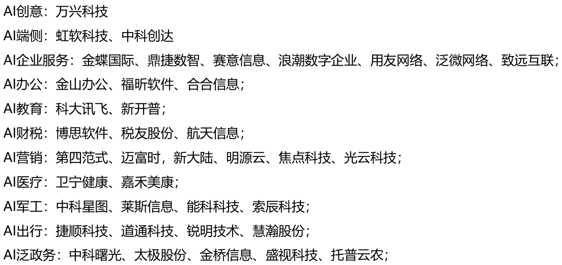 伴随基础大模型能力的不断提升和应用成本的大幅下降,越来越多的AI应用场景正被解锁,具体体现在通用场景的泛ERP领域(如金蝶国际、明源云、赛意信息、鼎捷数智等)、生产力工具(如金山办公、万兴科技、彩讯股份等),垂直场景的金融AI(如恒生电子、顶点软件、同花顺、中科软、宇信科技、京北方、长亮科技、天阳科技、百融云、新致软件等)、医疗IT(如讯飞医疗科技、卫宁健康、创业慧康、嘉和美康、医渡科技等)、物理AI(如地平线机器人、禾赛-W 、速腾聚创、索辰科技等);其他建议关注焦点科技、税友股份、国能日新、广联达、科大讯飞、格灵深瞳、云从科技、云鼎科技、神思电子、鸥玛软件、金桥信息、佳发教育等。
