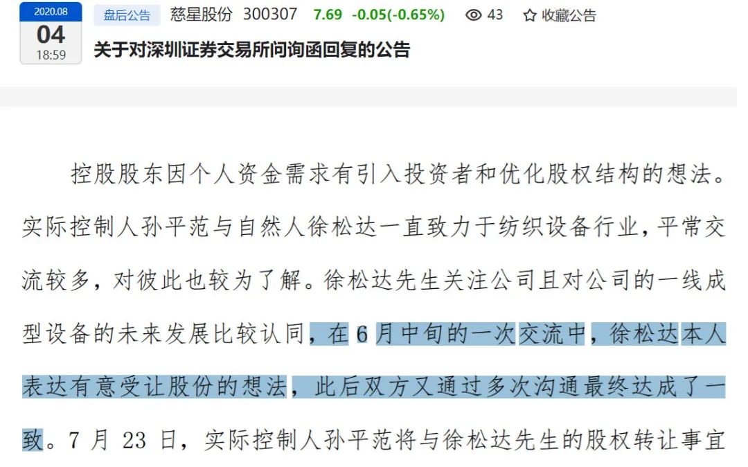 比如,慈星股份在回复交易所关注函时,披露了受让方徐松达的背景。据称,慈星股份实控人孙平范与徐松达都是纺织设备业内人,平常交流较多,彼此较为了解。在6月中旬的一次交流中,徐松达表达有意受让股份的想法,双方一拍即合,达成了总对价近2亿元的转让协议。公告称,徐松达看好公司一线成型电脑横机的发展,认可公司理念,“其本人认为当时股价处于低位,公司存在投资价值。”