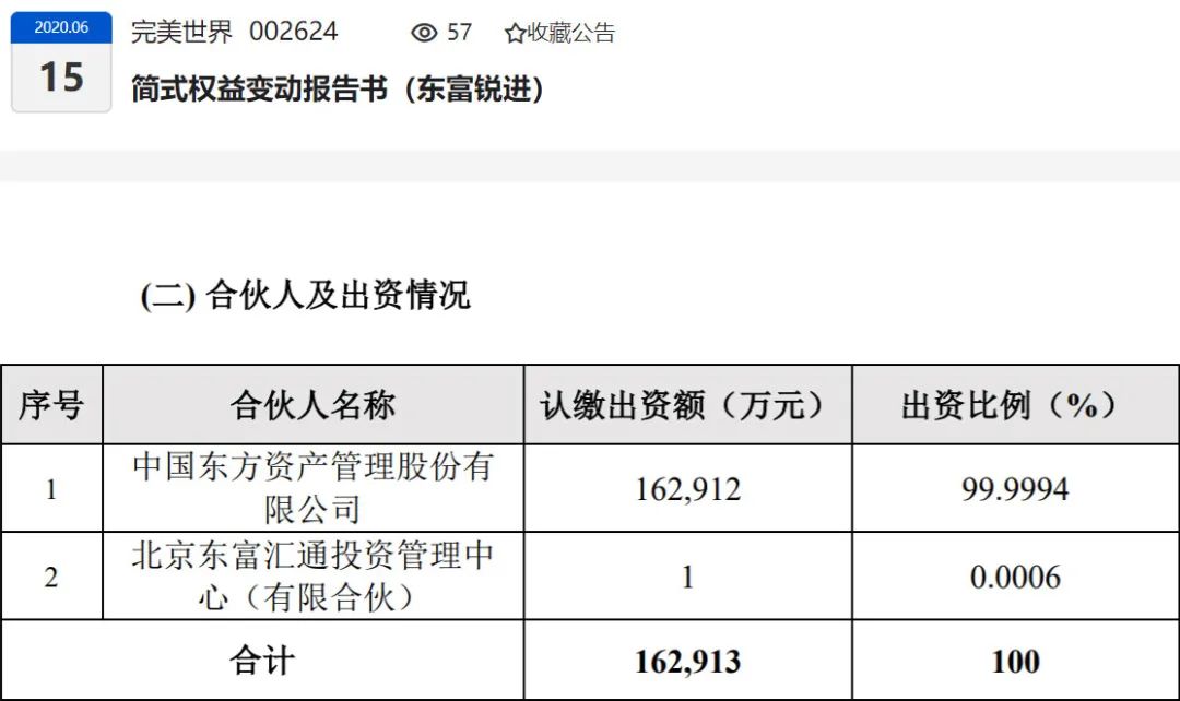 金额最大的交易发生在完美世界。该公司大股东作价28.7亿元转让5%股份,受让方北京东富锐进投资管理中心,系中国东方资产管理股份有限公司出资99.9994%成立的有限合伙企业。