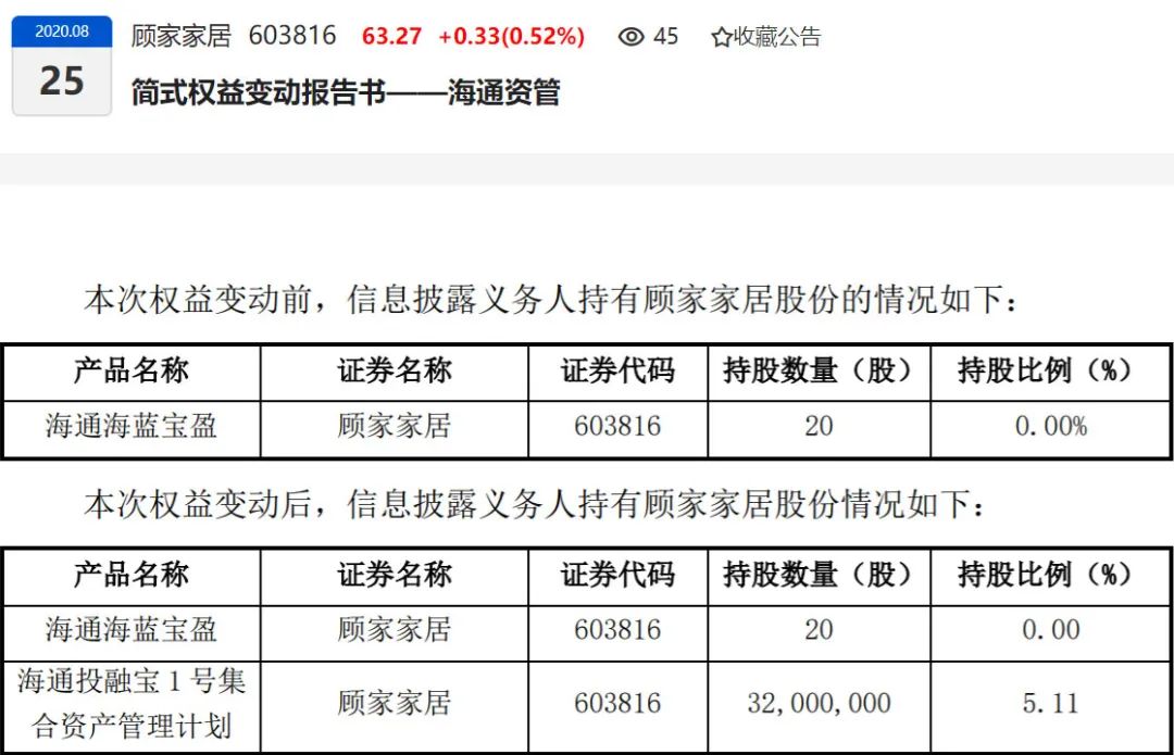 不过,更多的接盘机构幕后“金主”面目模糊。顾家家居8月21日公告,大股东顾家集团拟将所持5.11%股份协议转让给海通资管管理的“海通投融宝1号集合资产管理计划”,转让价58.4元/股,总价达18.688亿元。据介绍,海通资管“投融宝1号”面向合格投资者发行,其投资者与顾家家居及顾家集团无关联关系。