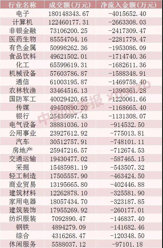 从近20个交易日的行业主力资金流向来看,申万一级28个行业悉数遭遇主力资金的净流出,其中主力资金净流出金额最大的电子行业流出了401.57亿元,其次为计算机行业净流出的266.33亿元。而从市场表现上来看,电子和计算机行业为近20个交易日涨幅位居首位和第二位的两个行业。