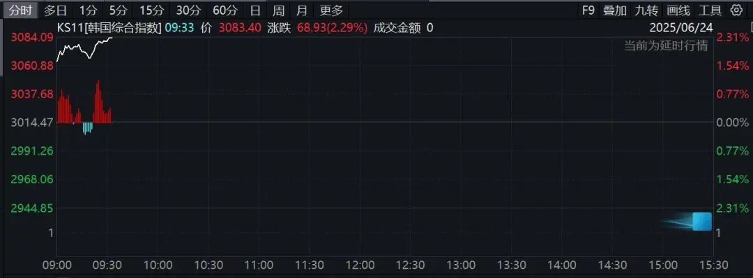 6月24日,日经225指数开盘涨1.2%。韩国KOSPI指数涨1.6%。截至发稿,韩国KOSPI指数涨幅扩大至逾2%。