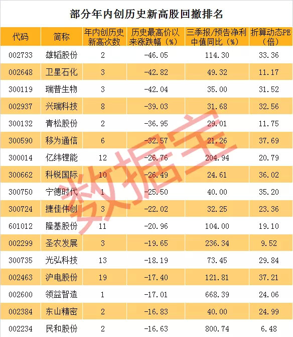 其中,今年两次创历史新高的雄韬股份,最新价较历史高点回撤超46%居首。该股前三季净利增长超114%,动态市盈率不到34倍。另外卫星石化和瑞普生物回撤超过40%,青松股份、兴瑞科技等个股回撤超30%。