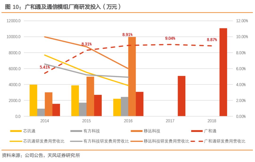 公司研发人员数量和研发投入持续增加,2018年研发费用较上年增长117.57%,研发费用占营收比重持续在9%左右水平。截至2018年底,公司研发人员占公司员工总数的57.85%,研发人员同比增长66.5%。2018年随着5G移动通信技术逐步成熟,公司启动了“5G无线通信模块及5G智能整机产品”的研发工作。