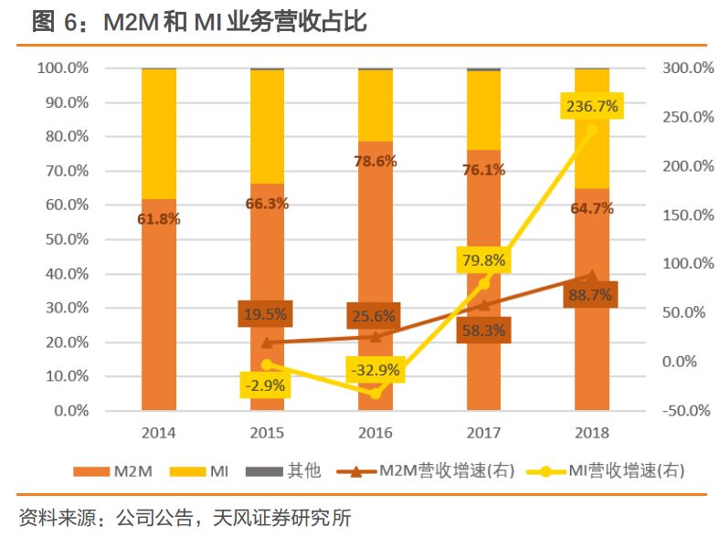 M2M业务:物联网连接数的高增长将促进公司M2M无线通信模块的销售增长。公司M2M领域产品主要为工业类(移动支付、智能电网、车联网、安防监控等)应用,受益于M2M连接数的提升增长及无线通信模块产品接口变化带来的均价提升,2018年M2M业务实现营收8.09亿元,同比增长88.7%。
