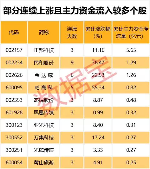 值得注意的是,38只连续上涨个股中,3只个股期间主力资金累计净流入超过亿元。其中,累计资金流入最多的为正邦科技,主力资金累计流入5.65亿元。