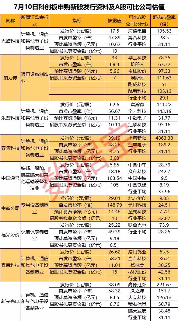 9只新股的平均首发市盈率(以扣非后净利润和发行后股本计算)为62倍。其中,中微公司的首发市盈率达148.79倍,为明日申购的新股中最高。巨额募资的中国通号首发市盈率最低,仅为18.18倍,但仍高于其当前的港股市盈率。光峰科技、安集科技、福光股份的首发市盈率不足50倍。