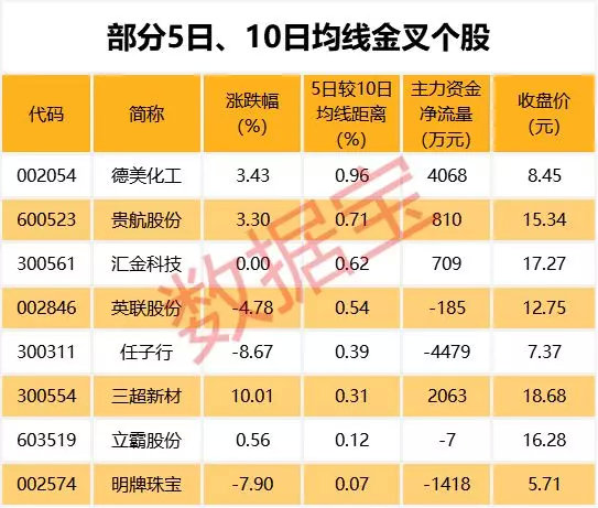 截至7月8日收盘,有8只A股的5日均线主动上穿10日均线,其中德美化工、贵航股份、汇金科技等个股的5日均线较10日均线距离最大,分别达0.96%、0.71%、0.62%。值得注意的是,德美化工、三超新材、贵航股份等个股主力资金净流入居前。