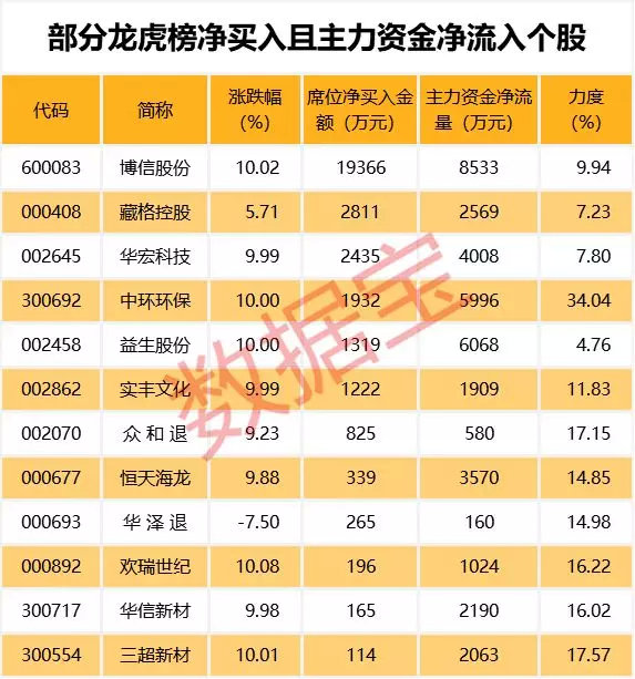 从盘口资金流向来看,主力资金净流入超千万且龙虎榜净买入个股共有10只,其中博信股份、益生股份、中环环保等个股资金净流入金额最大。净流入力度最大的个股有中环环保、三超新材、众和退,净流入力度分别为34.04%、17.57%、17.15%。