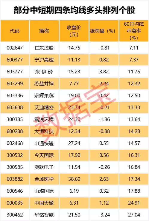 截至7月8日,21只个股5日、10日、20日、60日四条均线近日呈多头排列。其中仁东控股、宁沪高速、来伊份股价与60日均线的乖离率最小,分别为7.11%、7.37%、11.76%。