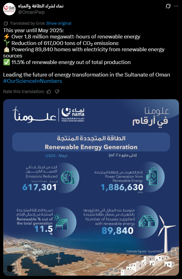 2025年前五个月,阿曼来自太阳能和风能的发电量占全国总发电量的比例升至近11.5%,较2024年年底的4.88%实现了翻倍增长。